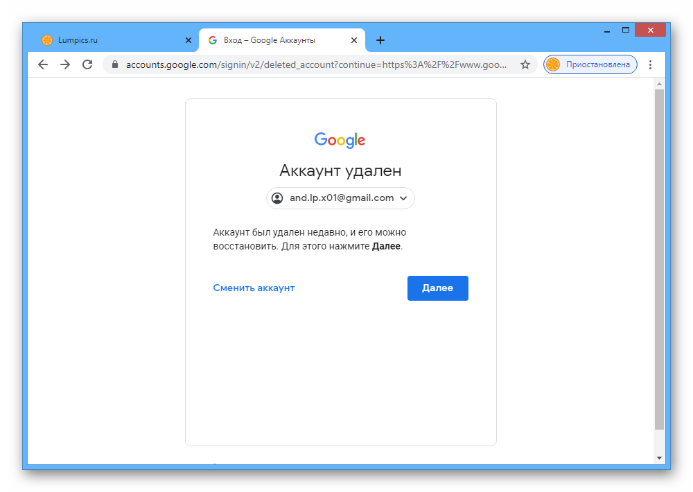 Несмотря на возможность удаления учетной записи, компания Google предоставляет средства для восстановления, воспользоваться которыми можно на официальном веб-сайте, задействовав браузер для ПК или телефон. В процессе решения этой задачи потребуются данные от профиля, включая пароли и код из SMS. Ознакомиться с деталями восстановления более подробно вы можете в отдельной инструкции на сайте.