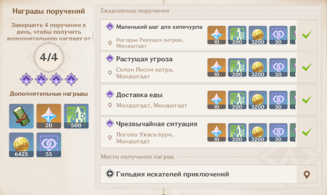 - Изысканный – предлагает 2-5 примогема, 20-30 AR, 3-4 сигилы (анемо / гео) и случайное количество оружия, артефактов и опыта.