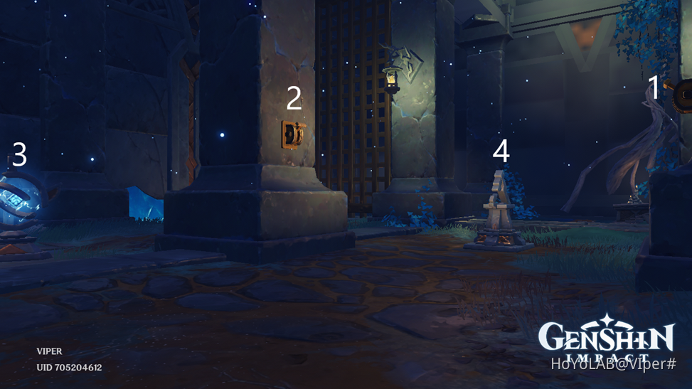 Фрагмент находится к западу от деревни. В незаконченной надписи даны явные подсказки какие статуи активировать — северную, юго-восточную, северо-западную, северо-восточную и юго-западную.