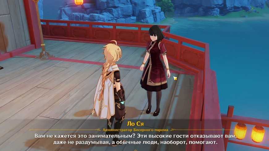 После разговоров со всеми гостями Бисерного парома и выполнения пары встречных квестов, игроку нужно вновь отправиться к администратору Ло Ся. Она находится на балкончике на этаже выше. Добраться до него проще всего по столбикам, на которых висят фонарики. Далее переходим на крышу и забираемся на балкончик.