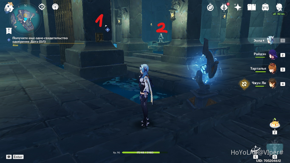 Двигайтесь дальше. Вас ждёт головоломка с плитами. Если следующая платформа загорается жёлтым цветом, то вы идёте по правильной последовательности. Если она вспыхнула красным — снова активируйте предыдущую плиту и ищите следующую. После того, как вы всё сделаете правильно, откроется проход дальше. Но вам нужен сундук, который лежит в небольшом углублении, позади плит с символами. Там лежит ключ, при помощи которого открывается дверь напротив.