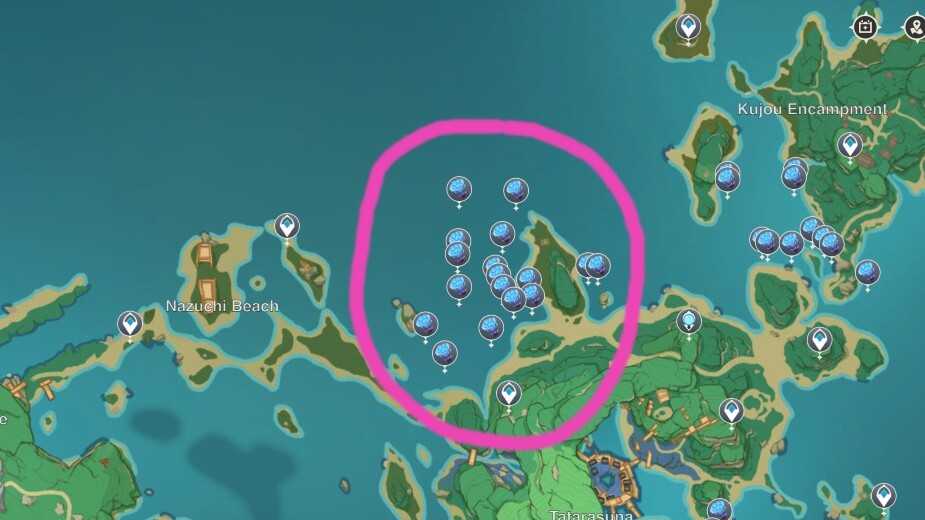 Рекомендуемое место выращивания Sea Ganoderma — недалеко от пляжа Назучи. Фото предоставлено: Интерактивная карта Тейвата.