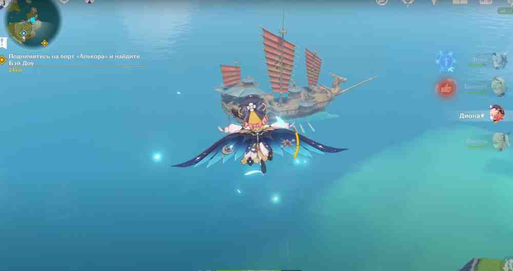Проблема в том, что корабль находится довольно далеко от берега. Чтобы попасть на корабль, открываем карту и находим ближайшую скалу. Забираемся на неё и планируем прямо на корабль. Также сюда можно попасть при помощи одного из героев с крио-способностями (замораживаем воду перед собой).