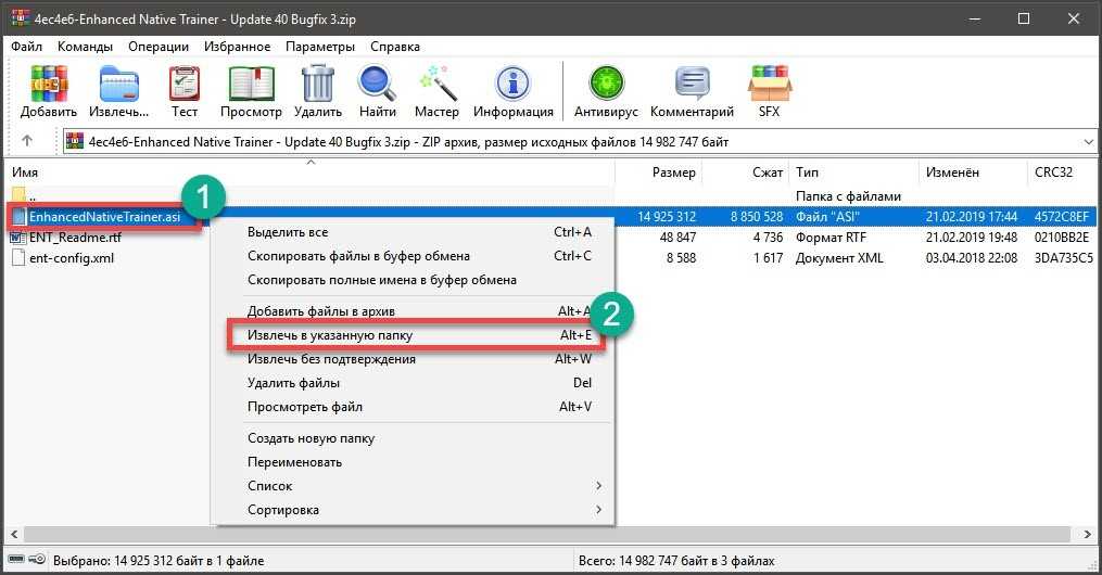 Откроется архиватор с нужными файлами. Теперь нужно щелкнуть правой кнопкой мышки по тому, у которого расширение «.asi» и в контекстном меню выбрать пункт «Извлечь в указанную папку» .