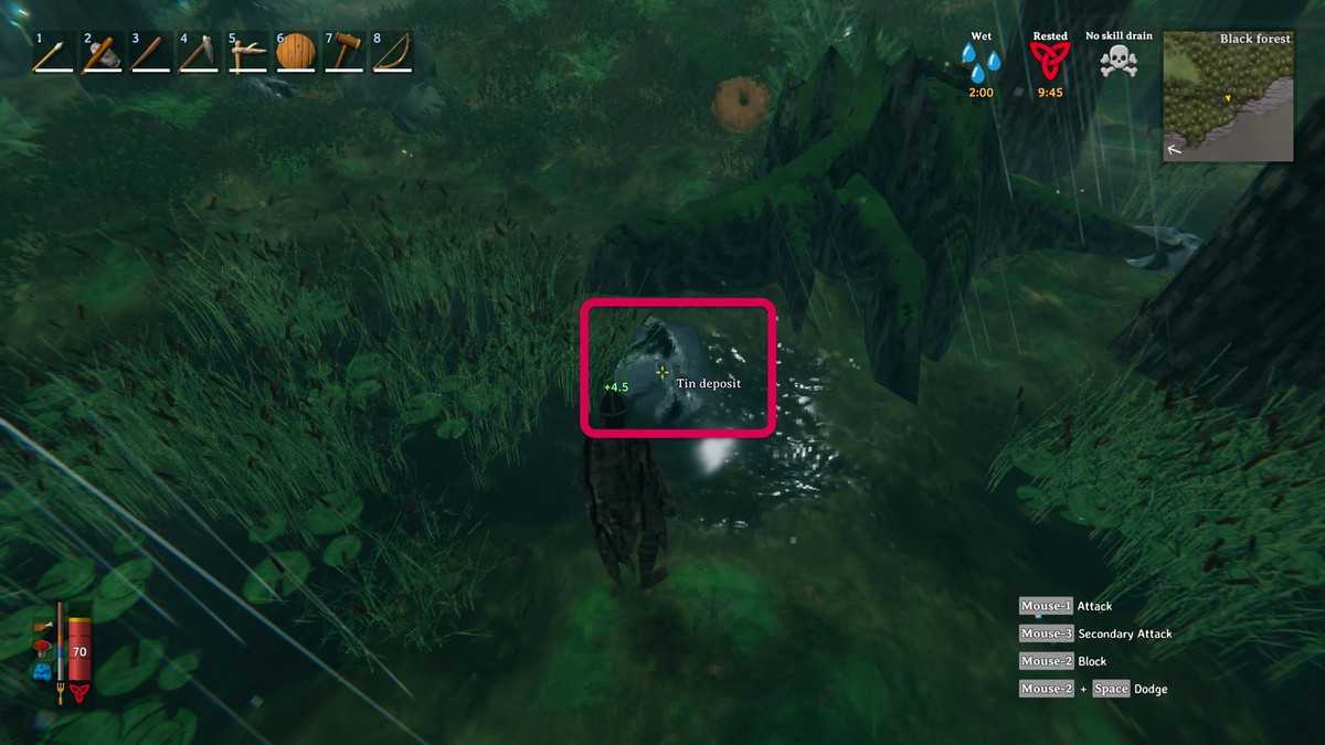 Олово также находится в соответствующих залежах, которые, в свою очередь, можно найти в биомах Чёрного леса, а именно — вдоль берегов рек и океанов. Требования к кирке здесь вообще отсутствуют, так что олово можно добывать чем угодно.