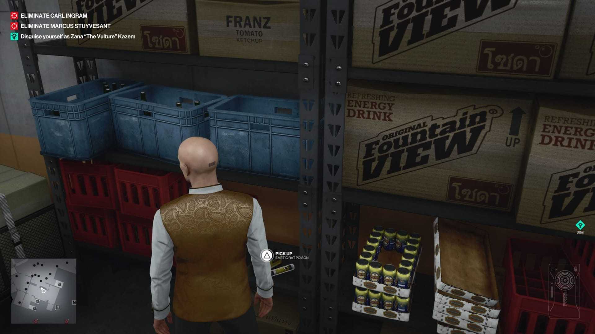 - Particular Palette: Получите маскировку официанта и найдите бутылку виски – одну бутылку можно найти в депозитной ячейке на Level 1. Еще одна находится в баре, там же можно оглушить официанта. Пройдите в бар на балконе (Level 2) и подайте виски. Когда Стуйвесант приблизится, предложите ему стакан. Можно сочетать со смертельным или рвотным ядом.