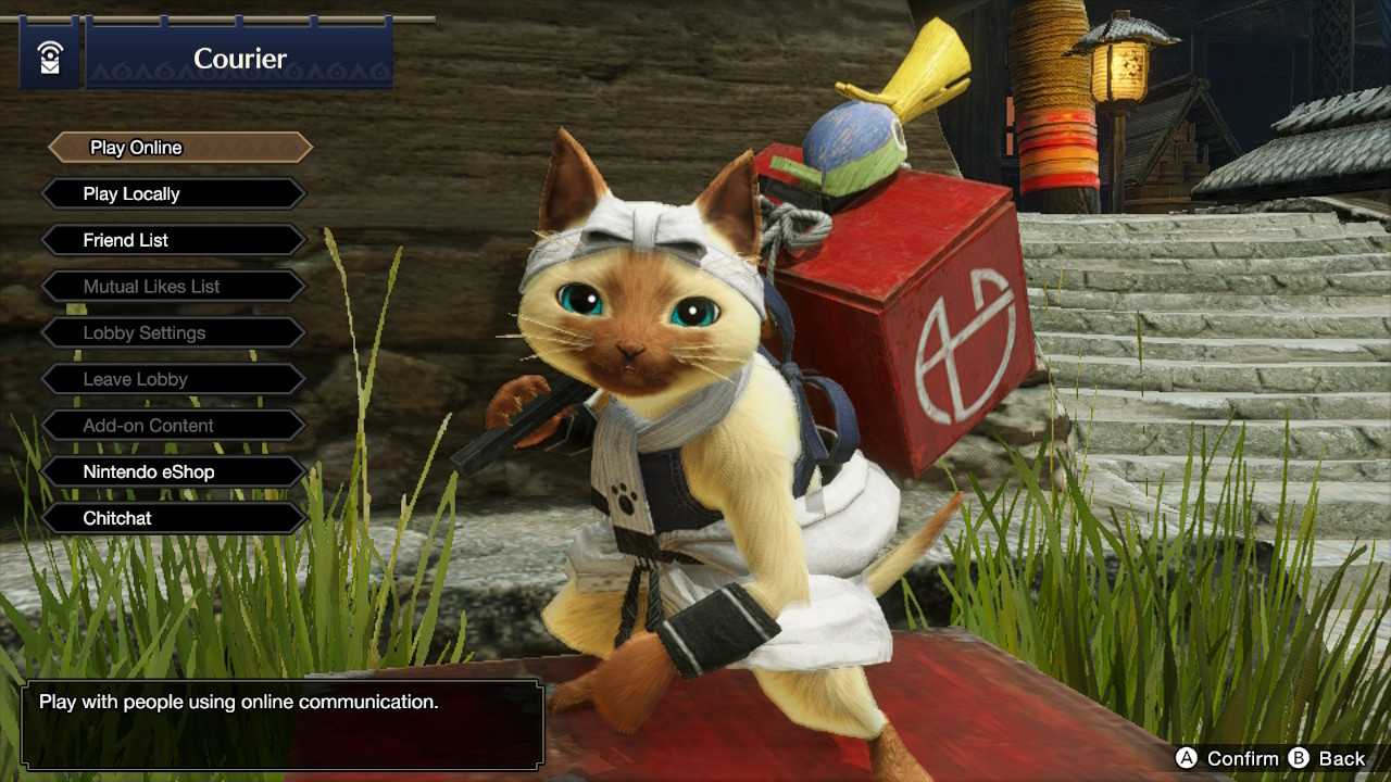 Итак, первый шаг к настройке многопользовательской игры — это поговорить с Сенри, курьером Felyne, который находится недалеко от центра деревни Камура. Сенри отвечает за соединение вас с другими игроками, поэтому вам нужно будет разговаривать с почтовым котом каждый раз, когда вы хотите начать или выйти из многопользовательского сеанса. (Вам также нужно будет поговорить с Сенри, чтобы получить любой DLC, например, бонусный набор предметов, который вы получите, если играли в демоверсию Monster Hunter Rise.)