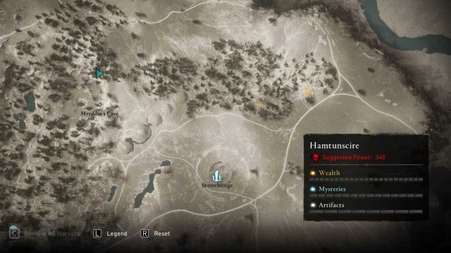 Учитывая выбранный сеттинг ожидаемо, что разработчики из Ubisoft активно эксплуатируют мифы и легенды, зародившиеся на территории Англии и Норвегии. Один из наших любимых случаев, который не просто остается на уровне диалогов, но и напрямую присутствует в геймплее – меч Эскалибур из легенды о короле Артуре. Это легендарное оружие по совместительству одно из самых сильных в игре, поэтому геймерам, решившим обнаружить древнюю реликвию, придется серьезно потрудиться. Чтобы найти Эскалибур в Assassins Creed: Valhalla потребуется собрать все «Сокровища Британии», после чего отправиться в пещеру Мирридин в Хамптуншире. Локация отмечена ниже на карте.