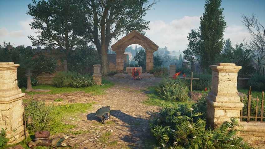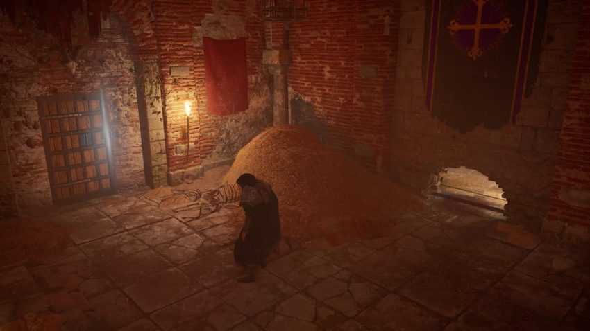 Затем подойдите ближе к передней части склепа, и вы можете подслушать, как охранник потерял ключ от подземелья. Ключ будут искать трое охранников, и если вы сможете убить их незаметно, вы можете получить недостающий ключ рядом с могилой в центре.