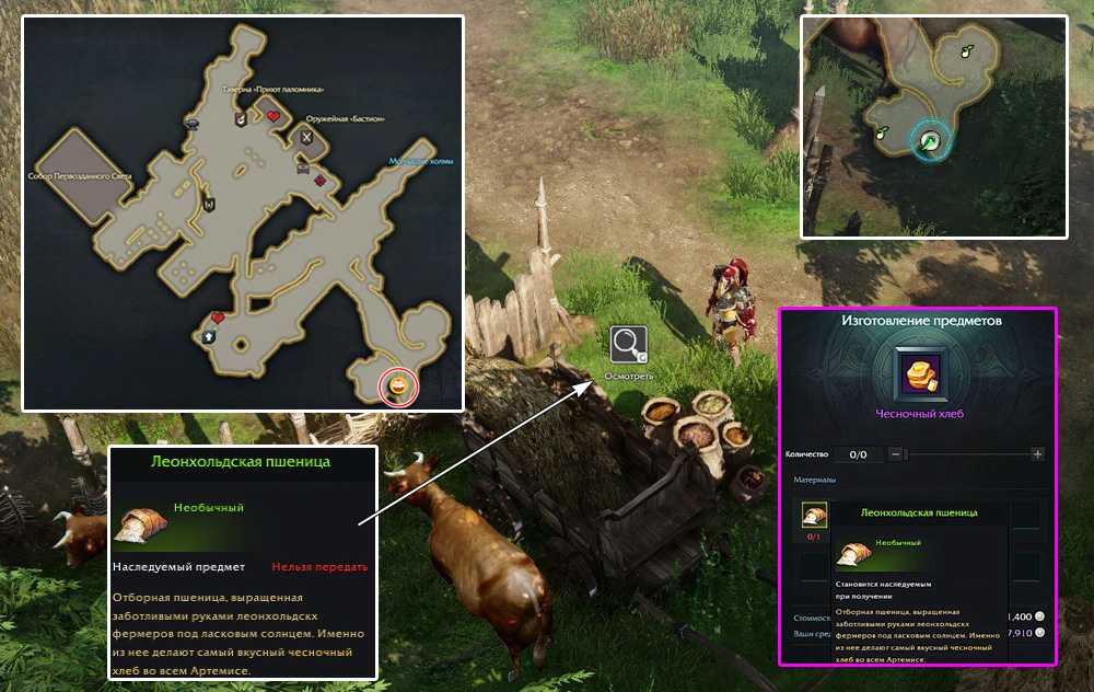 Находим на окраине Леонхольда пшеницу, а затем готовим хлеб у той же Хелли за 1400 серебра.
