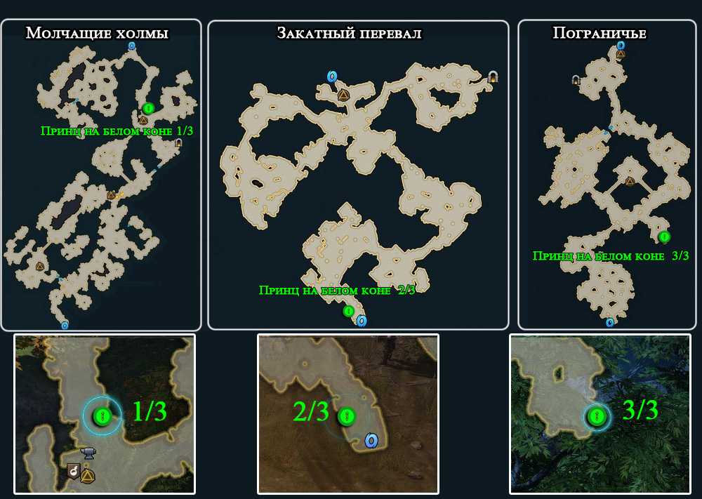 Первая часть – Молчащие холмы. Вторая – Закатный перевал, и от первой ко второй лучше доехать, так как она сразу у входа в локацию. Третья часть истории в Пограничье, в той же области, где выполняется ежедневка «Бесстрашие и сострадание».