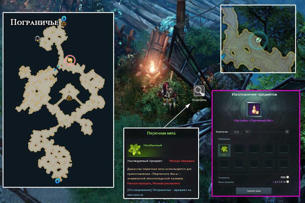 Необходимо найти ингредиент «Перечная мята» в Пограничье и приготовить у повара в Леонхольде настойку за 900 серебра.
