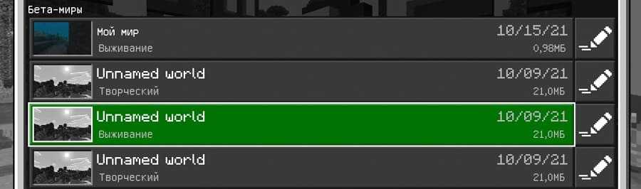 Созданный мир можно изменить двумя способами. В главном игровом меню нажмите кнопку Играть, а затем из списка миров выберите кнопку с карандашом рядом с выбранным миром. Таким образом, мы переходим в окно Настройки игры, где изменяем мир так же, как и при его создании. Некоторые параметры не будут доступны.