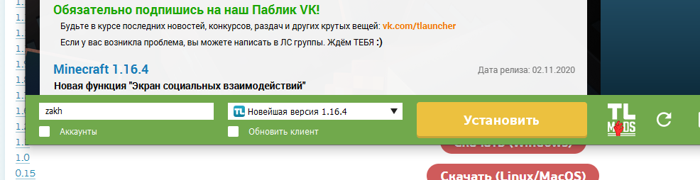 Из меню Лаунчера установка Майнкрафт происходит в один клик. Для запуска установки внизу стартового окна вносим логин и нажимаем кнопку Установить: