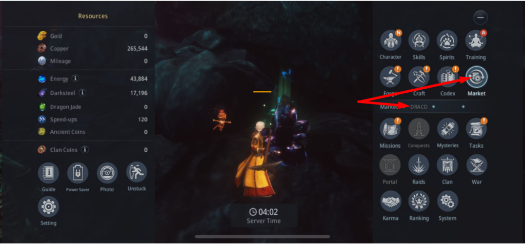 Помните, что вам также понадобится DarkSteel для создания и усиления вашего снаряжения. Чтобы изменить DarkSteel в DRACO, вам нужно достичь 40 уровня, так как только с этого уровня вы можете получить доступ к кузнице. Вы также можете получить к нему доступ прямо из вашего меню. Просто нажмите «Меню»> «Маркет»> «Драко».