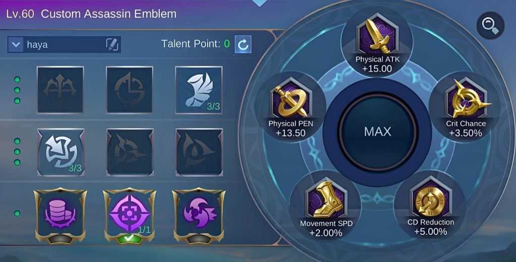 Выберите Custom Assassin Emblem Set и установите очки талантов, как показано ниже. Ловкость даст вам дополнительную скорость передвижения, чтобы преследовать врагов. Вторжение усилит ваше физическое перо, что повысит силу вашего навыка 2. Выберите High and Dry (увеличение урона на 7% по одному врагу поблизости) или череду убийств (15% восстановление здоровья и 20% увеличение скорости передвижения после убийства врага) в качестве конечной точки в зависимости от ситуации. Оба хороши для Инь.