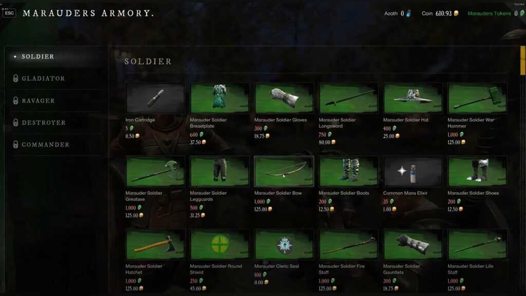 - Политика — эмблемы, баффы влияния, гильдейская броня и общие предметы.