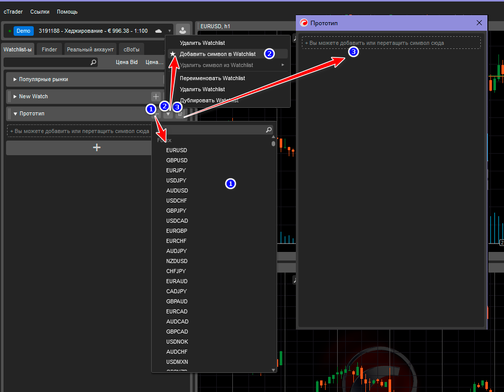- Добавлением инструмента в список Watchlist;