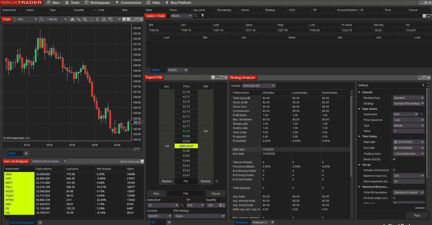 5 — Ninja Trader. Позиционируется как универсальная торговая платформа. Прерогативой терминала является возможность анализа кластерного типа графиков, что предоставляет трейдеру максимально точные рыночные тренды. Функциональные возможности NinjaTrader, кроме торговли на рынке Forex, открывают доступ рынку акций, форвардов, фьючерсов и опционов. Ninja Trader предлагает две версии терминала: Pro и Lite. Версия Pro предоставляет трейдеру фактически неограниченные торговые и аналитические возможности, однако её использование является платным, абонплата составляет около 50 USD в месяц. Платформа Ninja Trader может использоваться исключительно для выполнения аналитической работы.
