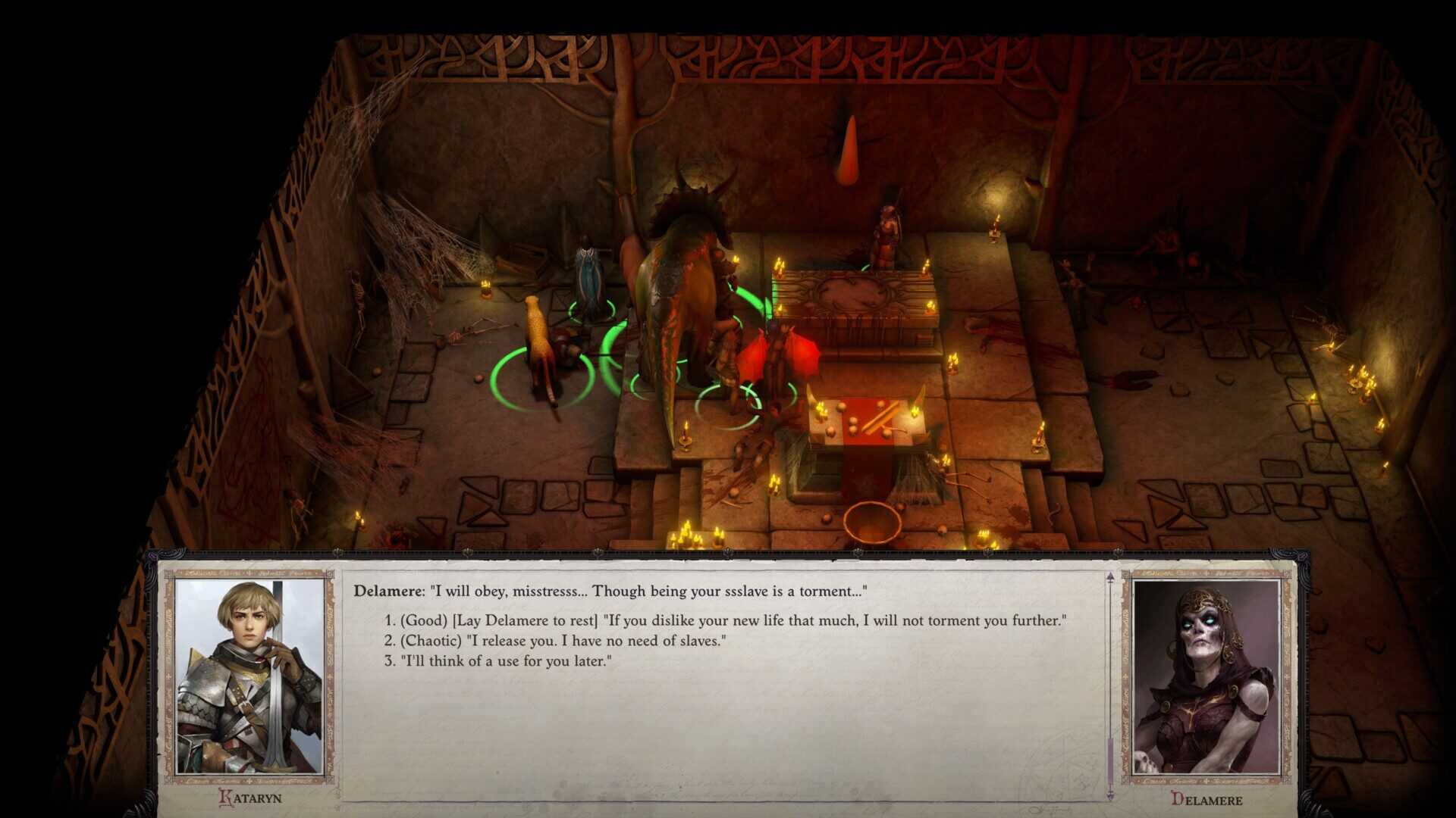 Внутри находится труп Деламер — некогда могущественной жрицы почитаемого в этом храме бога. Если вы являетесь Личом и завершили строительство Колонны черепов, то после квеста «Узник храма Деламер» сможете взять ее в свой отряд в качестве нежити.