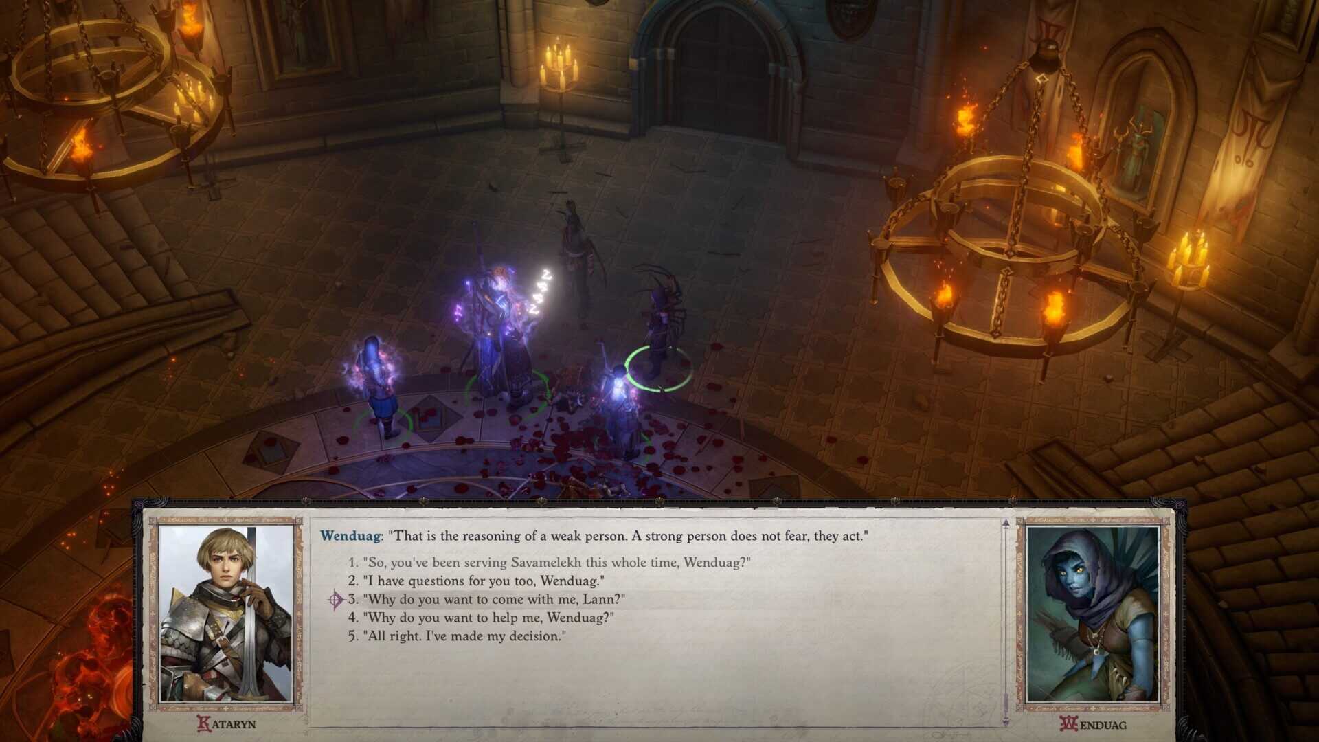 Однако, если вы дважды выберете путь Ангела: сперва покажете меч старосте, а затем воспользуетесь выбором ангела на боссе Пролога, то Вендуаг откажется вступать в вашу группу.