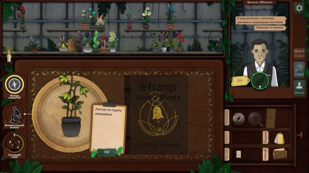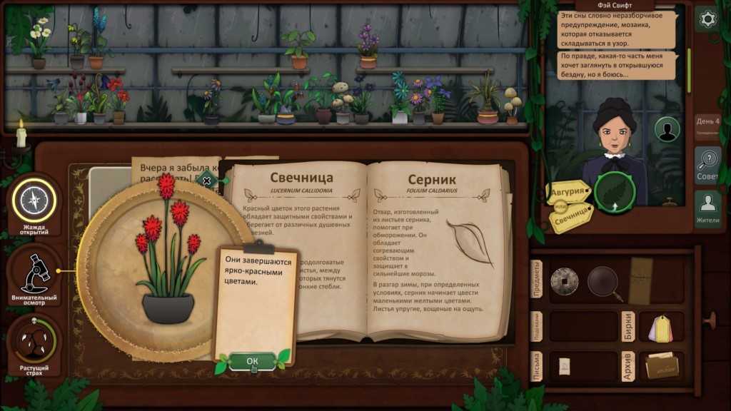 Четвертая глава, как и вторая, состоит из небольших частей. В первой мы знакомимся с После разговора с Итвордом у вас появляется задание — найти воду и ягоды. Проходим несколько комнат с простыми задачками и приходим к насосу. Здесь нужно установить рычаги в правильном порядке и с помощью спичек поджечь газ. Далее смешиваем топливо с помощью подсказки на экране. После этого к нам подходит новый друг и зовет за собой. Соглашаемся идти в комнату с кроликом.