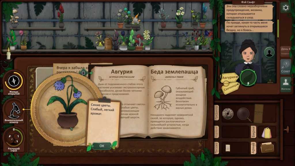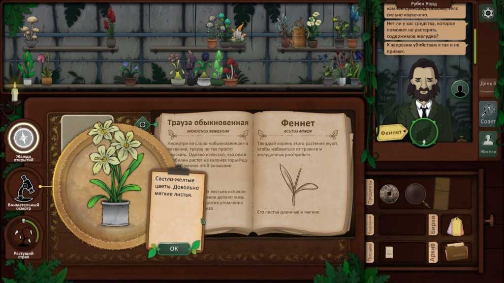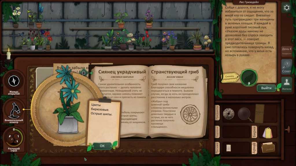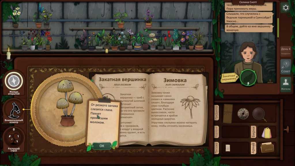 Вы можете определить гриб, который она дала вам вчера, как Беда землепашца, и, используя ваш путеводитель по грибам, вы можете увидеть, что Гентия королевская должна вылечить мужа.
