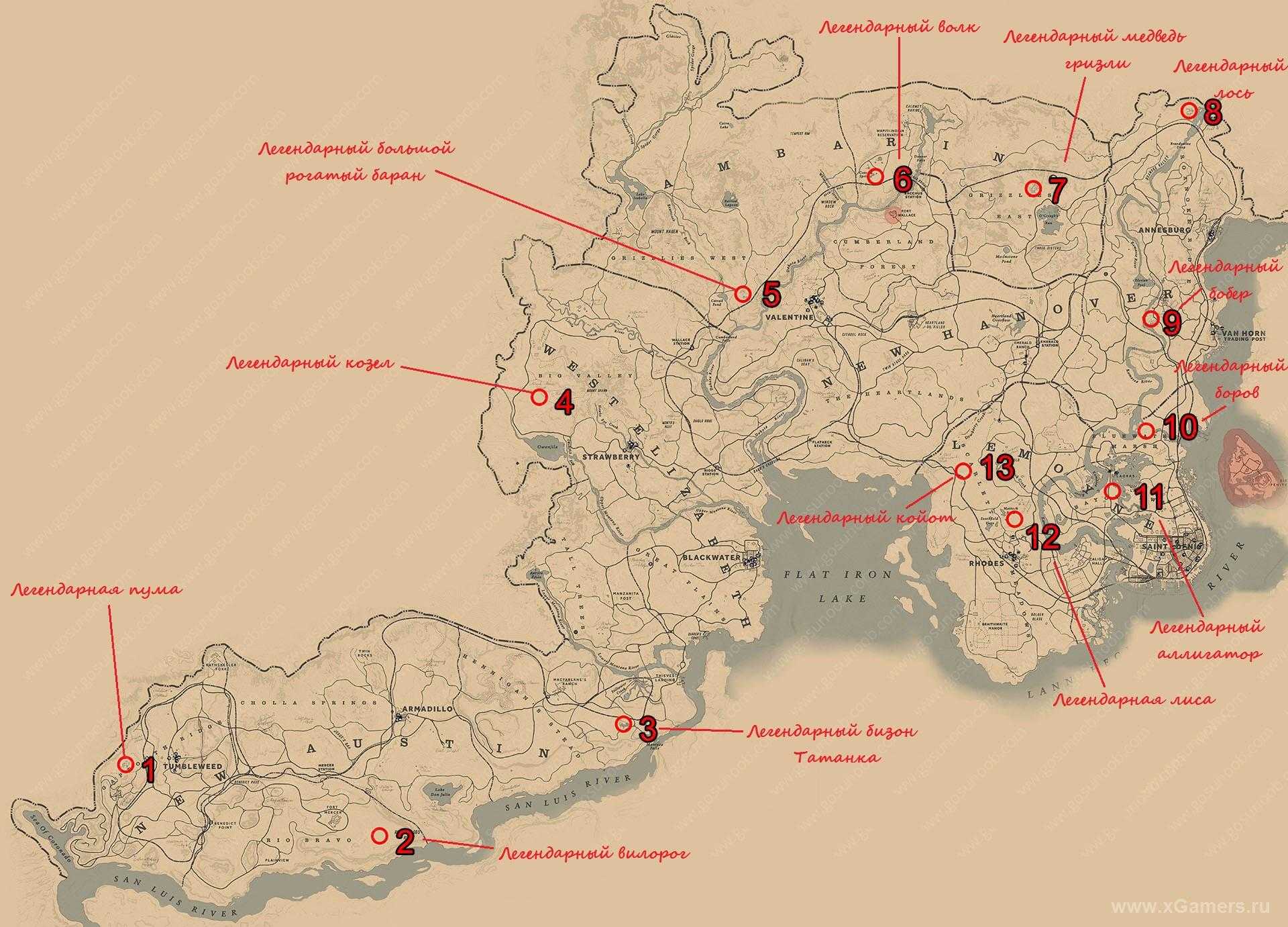 Успешная охота на легендарных животных поможет получить достижение «Зоолог» и «До кости». Карта с приблизительным расположением ареала обитания легендарных представителей тринадцати видов попадет в руки Артура в начале игры, после выполнения квеста Хосе — поиска легендарного медведя. На карте нет только легендарного вапити и оленя. Кстати, если редкий экземпляр окажется поблизости, игра сама заботливо об этом предупредит Артура, то есть можно спокойно исследовать окрестности в надежде наткнуться на легендарное животное случайно. Карта позволяет осуществлять целенаправленную охоту, что повышает шанс получить лут. Ниже приведен скриншот с той самой картой и пометками в тех местах, где примерно обитают легендарные виды: