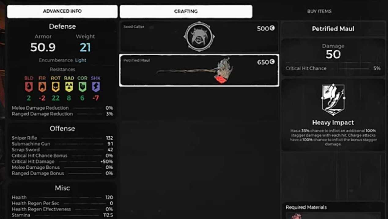 После каждого удара каменным молотом, возникает эффект, который наносит урон по площади. Кроме того, это оружие наносит врагам 100% ошеломляющего урона. Чтобы его создать, вам придется убить Энта на локации «Удушающая лощина» и получить «Плетеное сердце». Кроме того, для крафта понадобится семь Люминитовых кристаллов и 650 единиц лома.