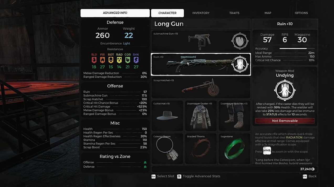 Класс Ex-Cultist начинается с набора Cultist, Coach Gun, Repeater Pistol, Scrap Hatchet, Аура Мендера мод оружия, и Дух черта характера. Каждое очко в Духе увеличивает скорость генерации мощности мода на 1,25 процента, что составляет максимум 25 процентов генерации энергии мода. Mender’s Aura имеет два заряда и создает круг исцеления, который восстанавливает 10 HP каждую секунду в течение 10 секунд. Диаметр круга составляет всего 2,3 метра, но нельзя недооценивать способность исцелять.
