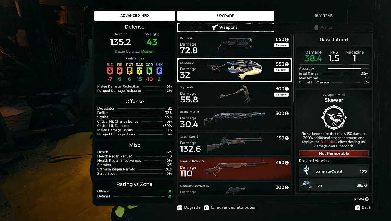 Обновление снаряжения — самая важная часть прокачки. Система улучшения довольно проста: чем больше тратите расходных материалов, тем сильнее получится вещь. Все апгрейды очень важны, поскольку от них напрямую зависит сможете ли вы справиться с противниками.