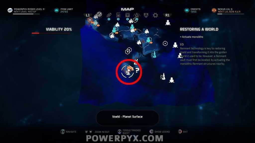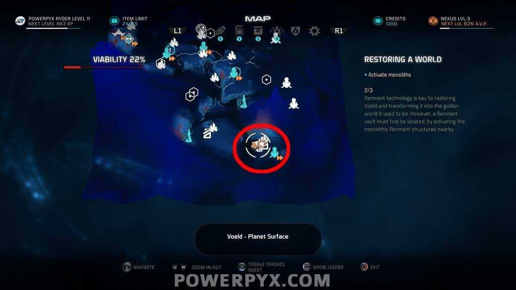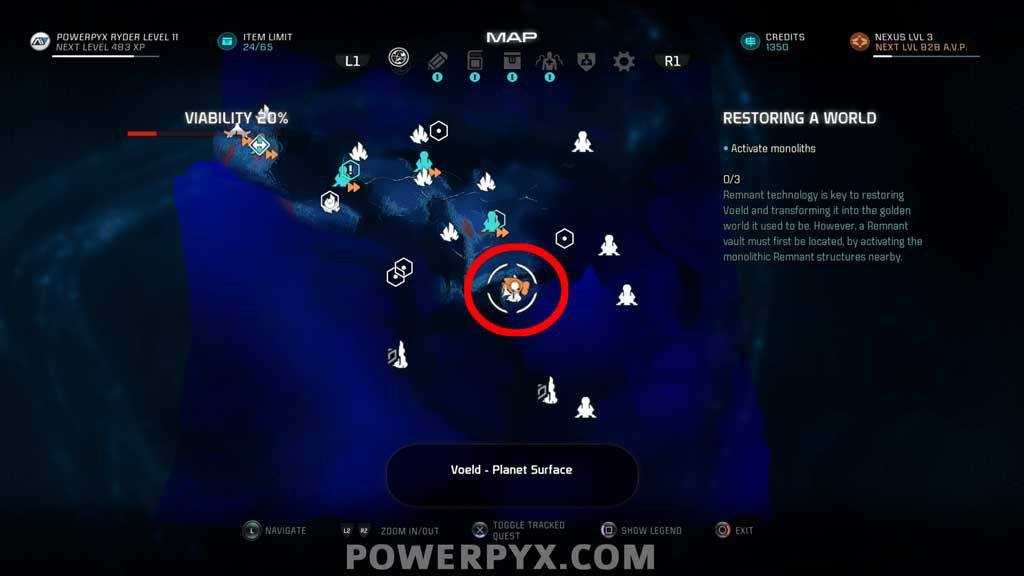 In the quest “Restoring a World” you must solve 3 remnant puzzles scattered across Voeld. See their locations and solutions below. For the first one you must find 3 glyphs. Two on the monoliths above the console and one on a snowy mountain a little bit east.