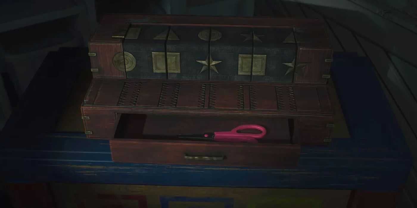 Важно отметить, что первая главная загадка Шерри на самом деле немного случайна. Шерри нужно выстроить символы из четырех блоков, чтобы получить ножницы