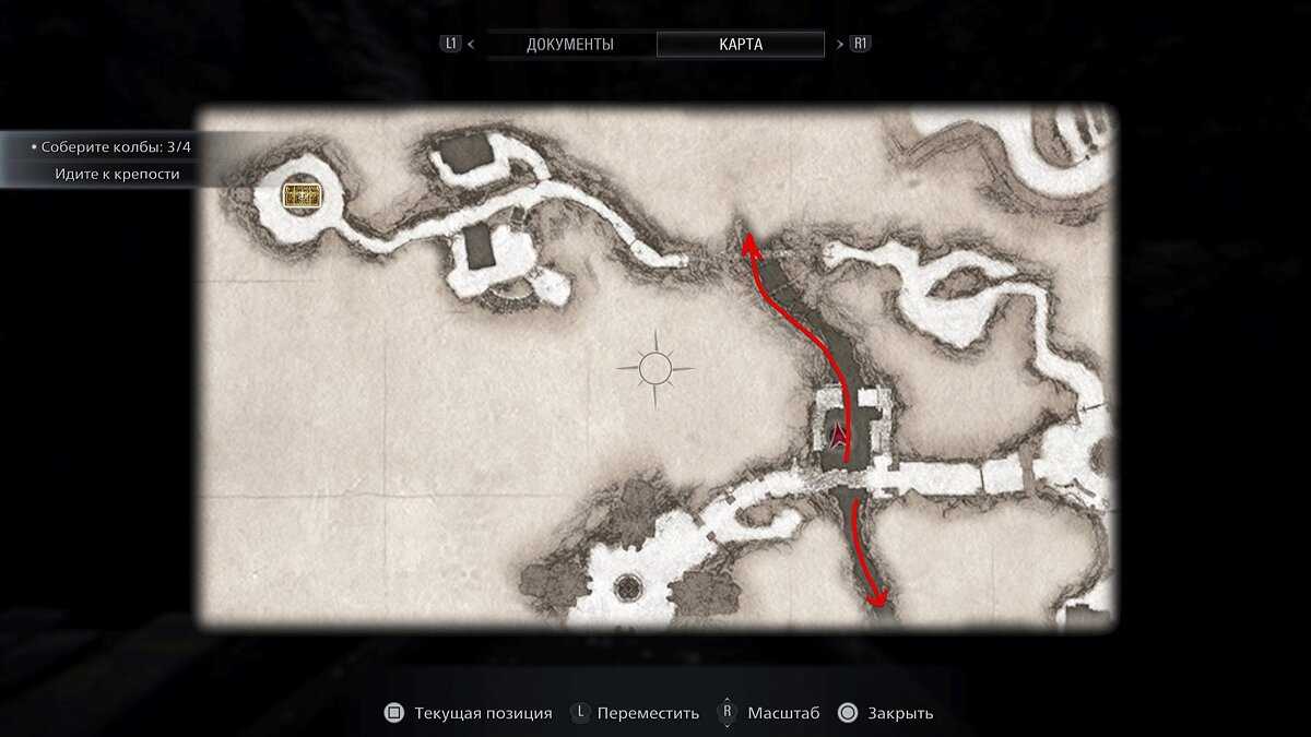 - После этого идите к разводному мосту. При помощи рукоятки опустите его и пройдите в новую локацию, в которой вы уже были до этого (когда выбрались из замка Димитреску). Через окно проходите на задний двор и примените колесо от колодца. Спуститесь по появившейся лестнице на дно колодца, где надо решить загадку. Награда – большой кровавый рубин.
