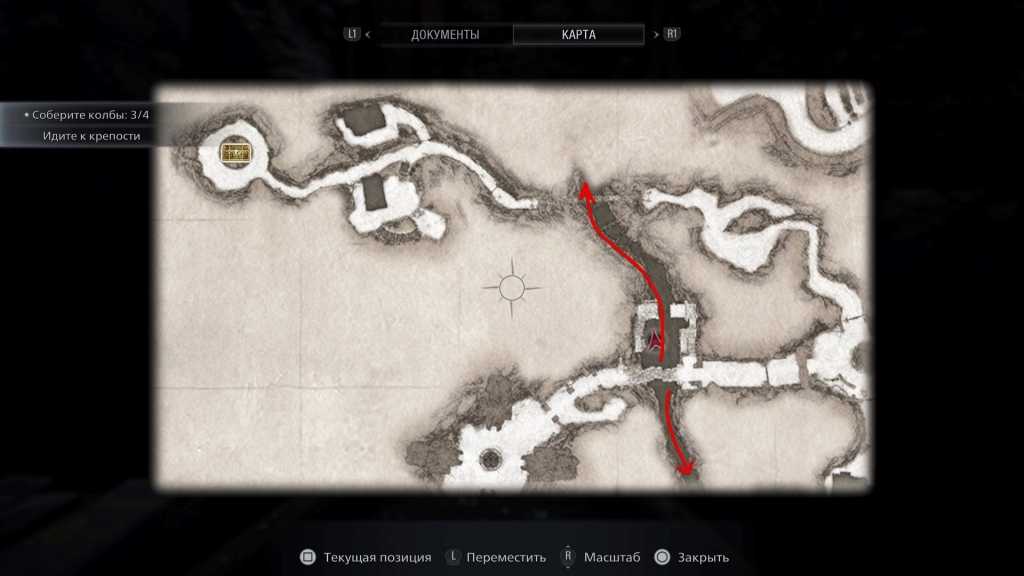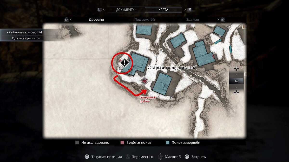- Выходите и идите к разводному мосту. При помощи рукоятки опустите его и пройдите в новую локацию. Вы здесь уже были ранее, после того, как выбрались из замка Димитреску. Идите через окно на задний двор и примените колесо от колодца. Спускайтесь по лестнице на дно колодца. Здесь предстоит решить загадку. В награду получите большой кровавый рубин.
