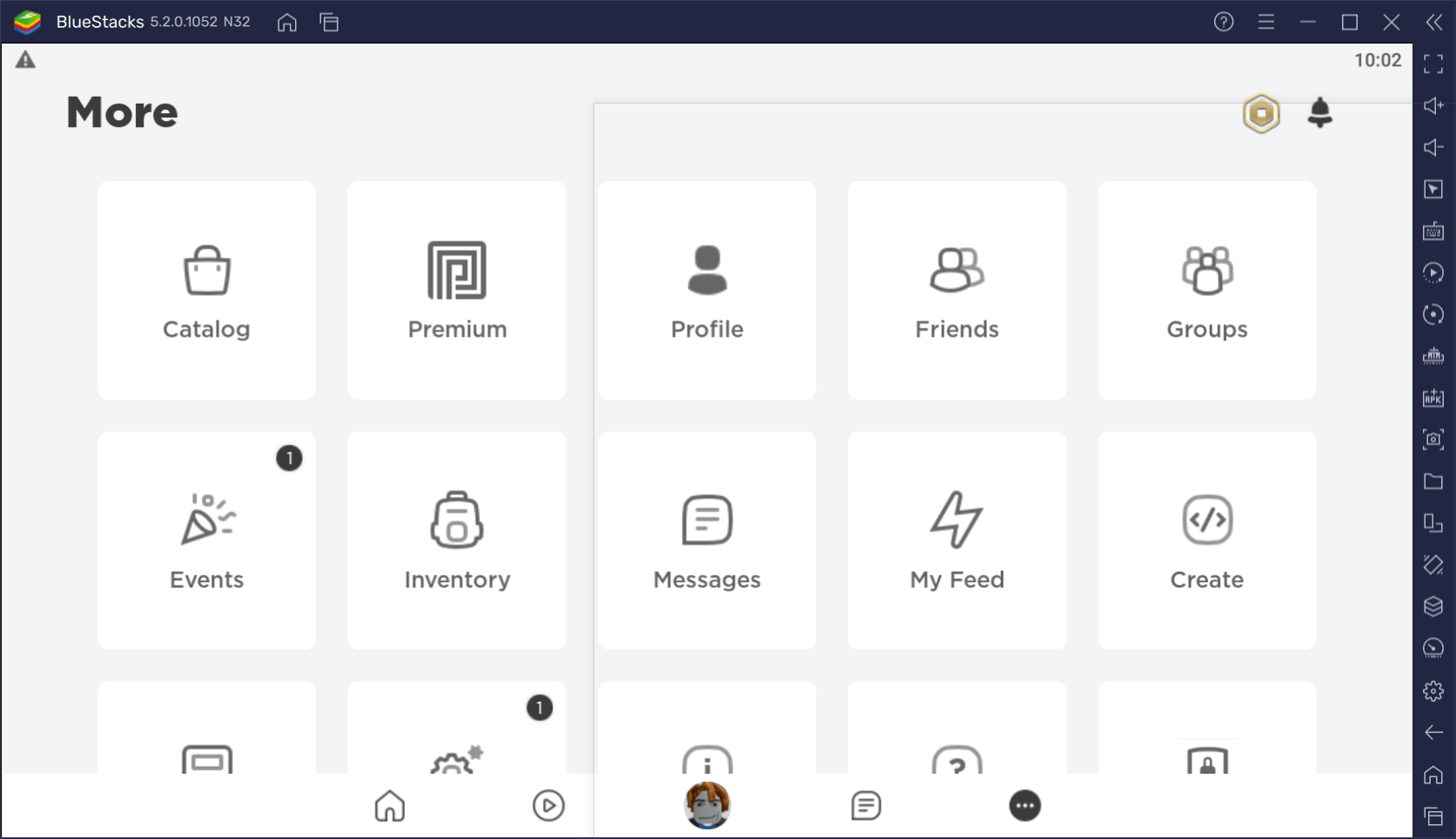 - More. Помечена иконкой с тремя точками. Здесь находится ваш инвентарь, список ивентов, сообщения, профиль, настройки и другие функции платформы. Изучите их.