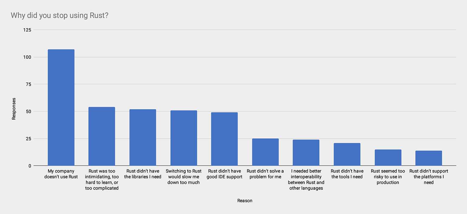 Исследование команды Rust «Почему программисты не пишут на Rust». Главная причина — компания не использует Rust. Изображение: Rust Blog