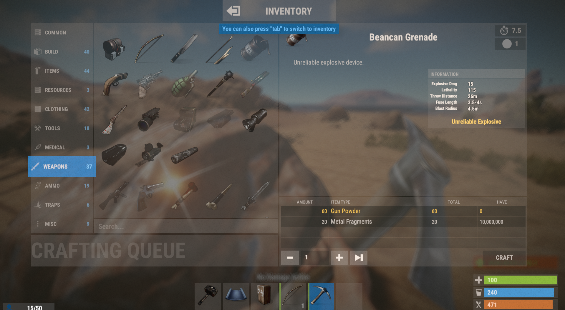 В игре крафтится всё: оружие, медикаменты, еда, стройматериалы, оборудование. Чтобы создать некоторые предметы, сперва придется изучить рецепты.