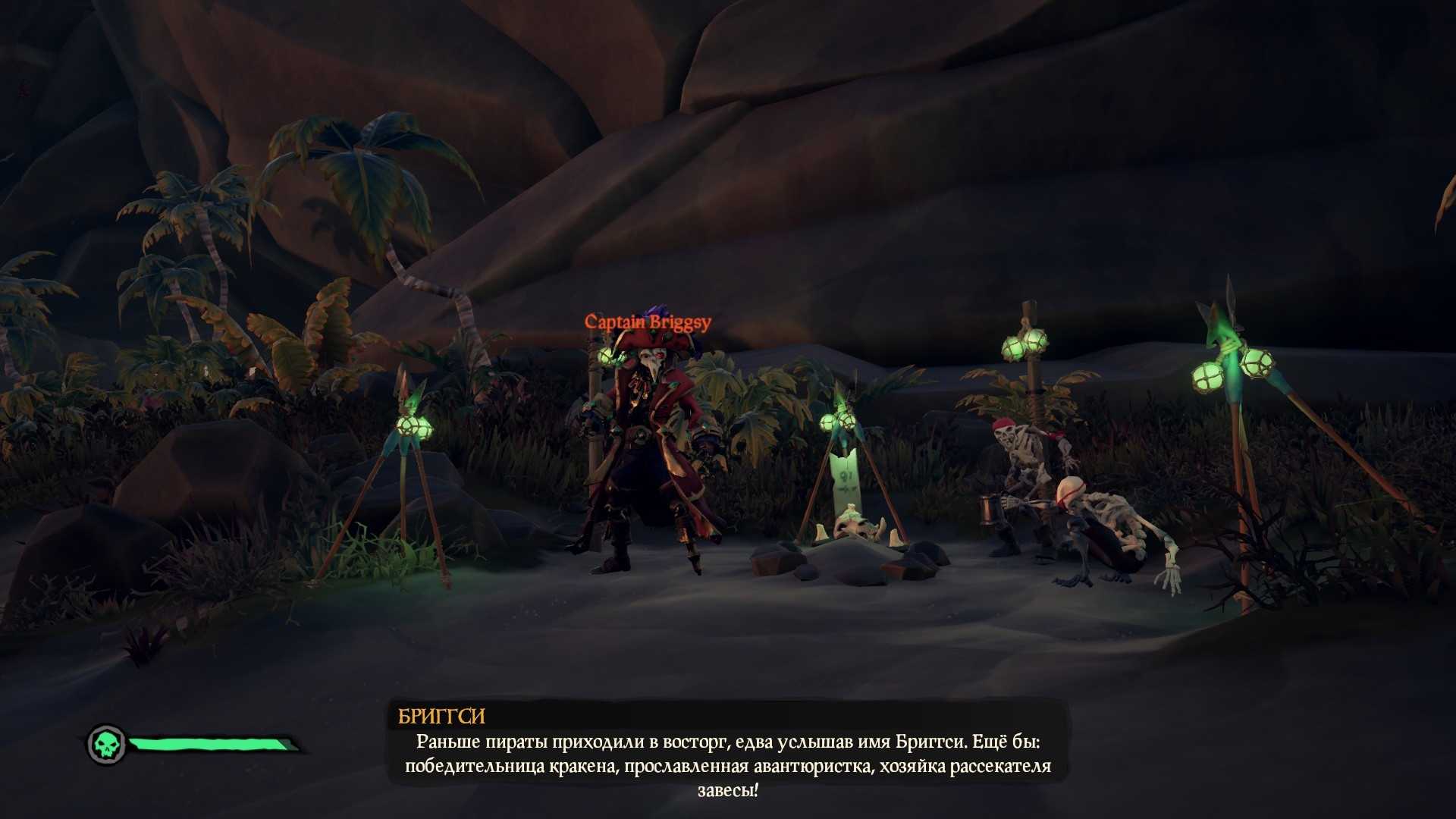 Мы наконец смогли найти Бриггси в истории «Проклятая путешественница» в Sea of Thieves: Tall Tales, теперь в ходе агрессивных переговоров нам следует уговорить капитаншу отдать те знания, которые были известны ей о драгоценных камнях, одновременно с её черепной коробкой.