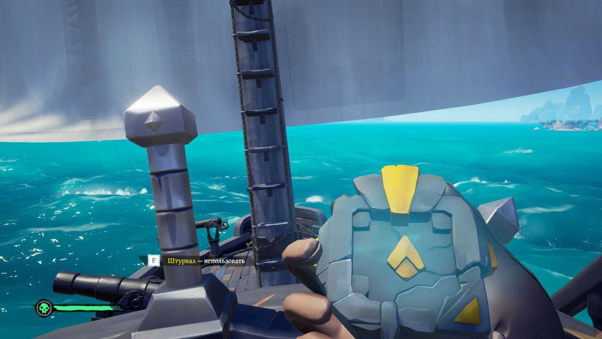 Еще одна особенность, на которую работает отсутствие каких-либо чисел в игре — это повышенный уровень погружения в процесс. На экране нет почти никакого интерфейса (лишь полоска здоровья, количество пуль и редкие выезжающие окна с информацией), практически все интерактивные действия совершаются без использования меню. Любая активность в Sea of Thieves осуществляется «руками»: если нужно повернуть корабль на запад, не нужно зажимать стрелку «влево» — нужно взять штурвал и поворачивать его до тех пор, пока судно не станет на нужный курс. И о том, встало оно или нет, не скажет ни компьютерный матрос, ни удобное оповещение: только компас, расположенный справа от штурвала, и само солнце.