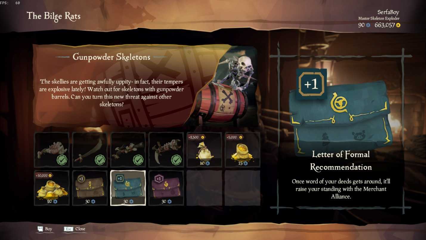 Последние три предмета могут понадобиться пиратам со временем. Каждое из рекомендательных писем добавляет один полный уровень к рангу одной из фракций. Например, золотое рекомендательно письмо поднимет уровень репутации игрока у Золотых Хранителей (Gold Hoarders) с 45 до 46. При этом, все оставшиеся очки опыта перенесутся на следующий уровень (если у вас на 45 уровне была набрана половина XP до следующего, то в итоге у вас станет 46 с половиной). Оставшиеся два письма аналогично повышают ранг Торгового союза (Merchant Alliance) и Ордена Душ (Order of Souls).