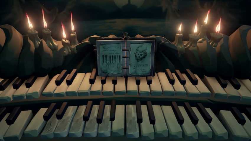 Возьмите журнал слева и подойдите к Джеку Воробью, который вручит вам ноты. Вы можете получить доступ к этим нотам в конце дневника сказок. На левой странице отмечены восемь фортепианных нот, а справа — ноты. Посмотрите на сам орган, и как только вы начнете с ним взаимодействовать, перед вами откроется журнал для справки. Посмотрите в средний ряд клавиш и найдите те, которые выглядят изношенными — сравните их со схемой клавиш в книге, а с крайней левой нотой как 1 сыграйте следующие ноты, выбирая их по отдельности и нажимая кнопку перехода: 1 , 2, 3, 4, 5, 6, 7 (черная клавиша между 5 и 6) и 8, которая является той же клавишей, что и 5.
