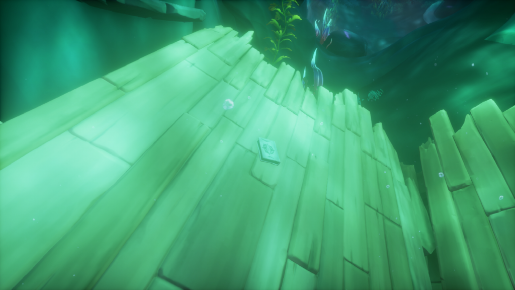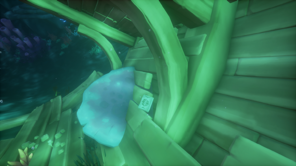 На месте разбросаны обломки, покрытые яркими кораллами. Ныряй и плыви вдоль обломков на глубину. Если по пути к световому столбу ты подберешь трезубец, не бери его с собой под воду — плыть с ним не удобно, а на месте где предстоит битва почти всегда можно будет найти новый.