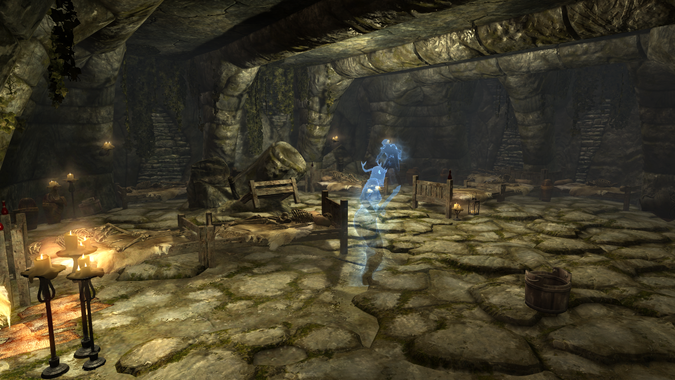 В руинах нас ждут призраки драконопоклонников и драугры, а их трупы лежат в собственных кроватях – действительно жуткое зрелище. Когда мы найдем дневник Скорма, станет понятно, какой способ отправиться в Обливион выбрали культисты – они отравили колодец. За тысячу лет яд точно выветрился – по крайней мере, так надеется Довакин, залезая в колодец. Там действительно больше нет яда. Чуть дальше будет трапезная и комната алхимика – кстати, если внимательно читать записки, то можно понять, что не все разделяют план безумного драконьего жреца Рагота. Алхимичка Фрода убеждает одуматься и не заставлять культистов убивать собственных детей перед ритуалом, но ее слова ничего не значат для сумасшедшего. Тело Фроды лежит на троне с мечом в груди.