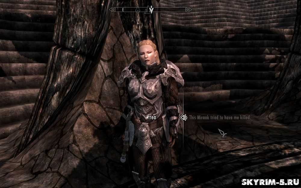 С этого момента прохождение «Скайрим Драгонборн» начинает набирать обороты. Во дворе храма Мирака среди зомбированных рабочих находится женщина, Фрея. Она предпринимает тщетные попытки убедить друзей прекратить стройку. Фрея избежала влияния чар Мирака благодаря волшебному амулету, а её отец, по совместительству шаман скаалов, защищает оставшихся соплеменников путём поддержания магического барьера. Вместе с новой знакомой герой отправляется внутрь храма.