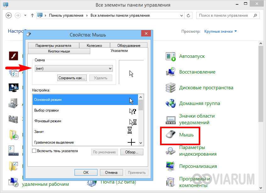 - Возможно, у вас сбилось изображение стрелочки. Перейдите в свойства мыши из Панели инструментов, и на вкладке «Указатели» измените внешний вид курсора. Затем верните его «По умолчанию». Это работает и для Windows 7, и для 10-ой версии.