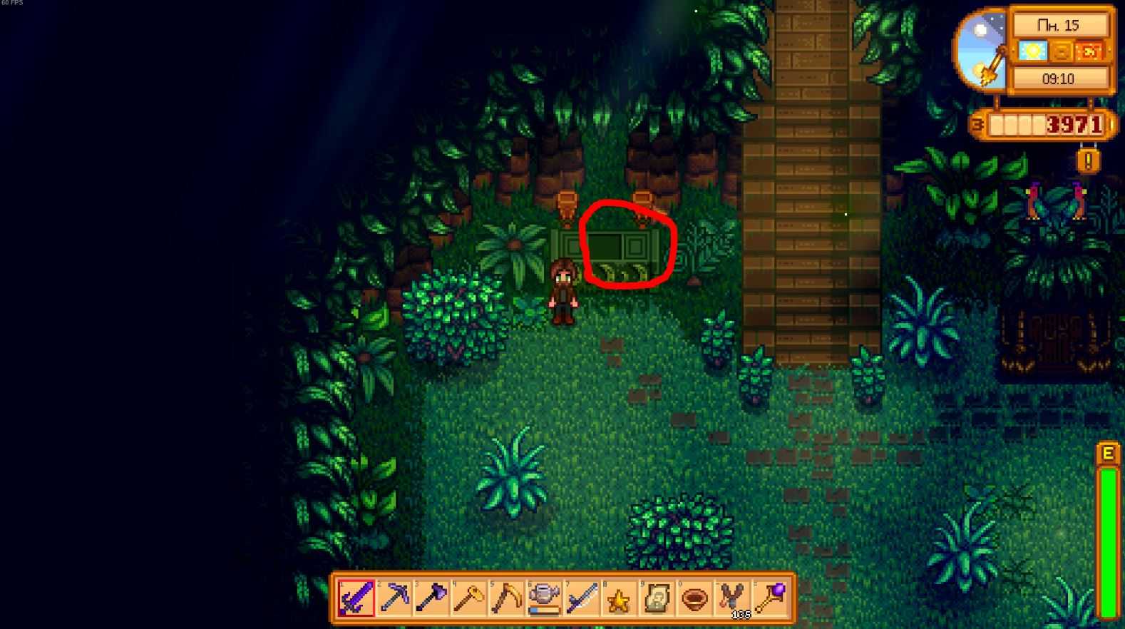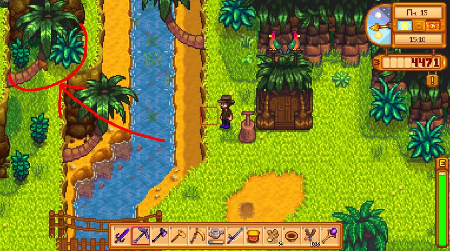 В джунглях есть тайный проход вправо, а там четыре постамента. Постаменты соответствуют частям острова (левый – где ферма, нижний – порт, правый – джунгли, верхний – область вокруг вулкана). В дни, когда на острове дождь, появляется одна в птица в одной из четырех частей острова, если к ней подойти, выпадает какой-нибудь драгоценный камень. Его нужно поставить на соответствующий постамент. У разных людей где какие птицы появляются, будет отличаться