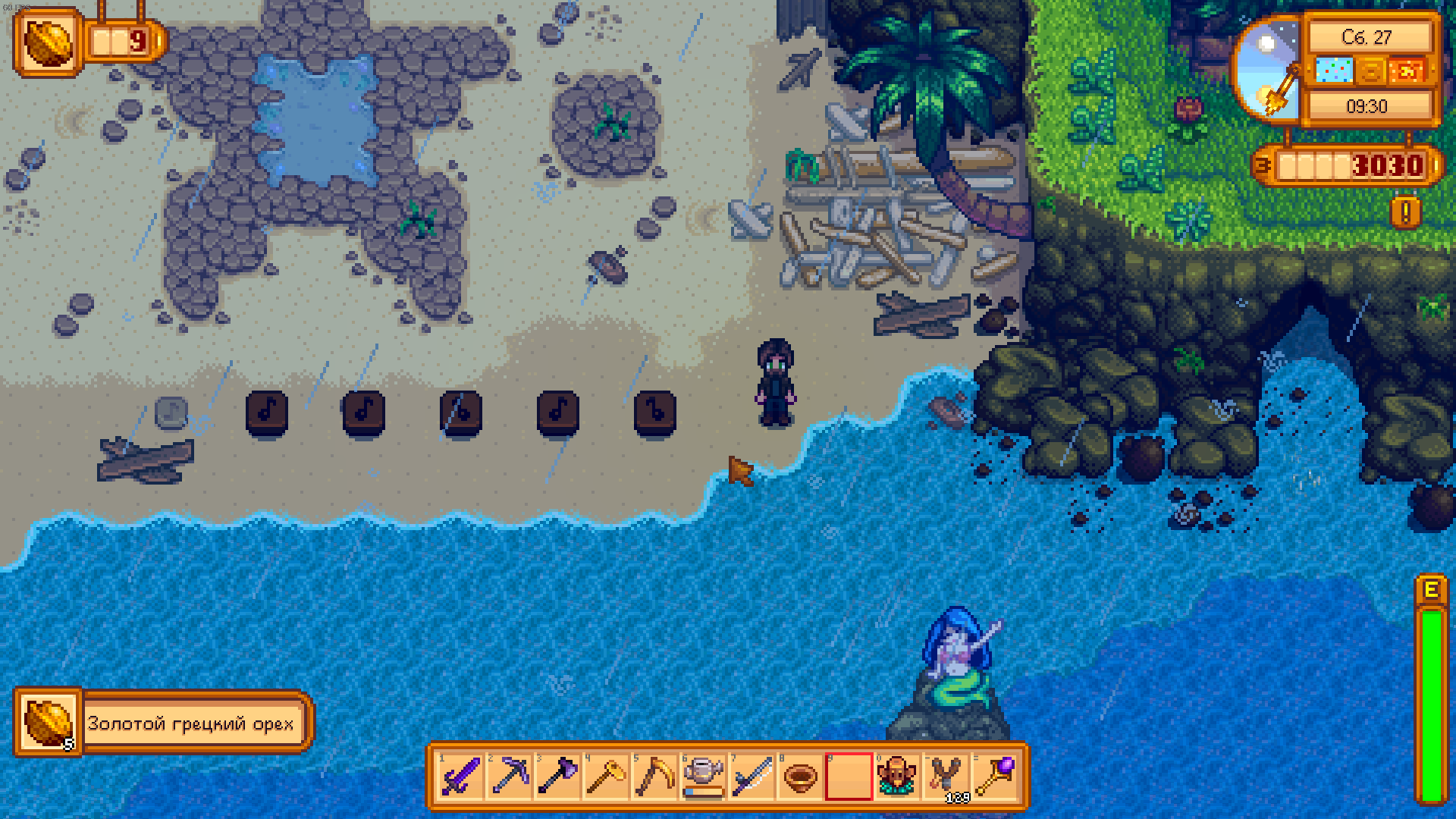 В заливе, только в дождь, появляется русалка. Вам понадобится 5 музыкальных блоков: расставьте их на камни, как на скрине, нажмите на первый 2 раза, на второй 11 раз, на 3 – 9, на 4 нажмите 5 раз и на 5 7 раз; затем пробежитесь мимо 1 до 5 и получите 5 орехов (количество нажатий может отличаться, узнать его можно по камням на клетке: большой – 5 нажатий, маленький – 1)