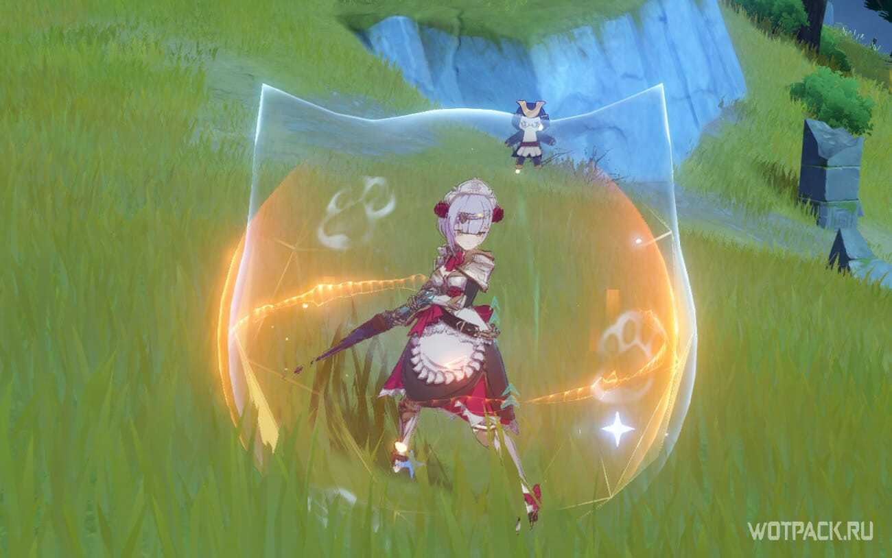 Первый – если среди персонажей есть щитовики с разными элементами. Оптимальным выбором будут Ноэлль/Чжун Ли (гео), Диона (крио), Бэй Доу (электро), Тома/Синь Янь (пиро) в любой комбинации – их элементальный навык дает щит без всяких условий. Нужно просто поставить любых трех в отряд, по очереди переключиться на каждого и прожать скилл до момента исчезновения предыдущего щита.