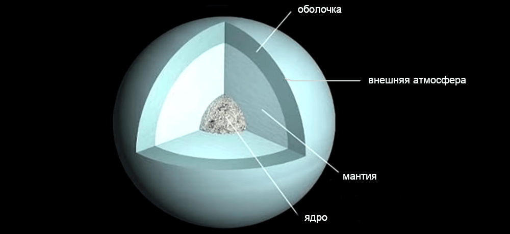 Наиболее холодная планета солнечной системы состоит из четырех слоев. Таких как ядро, мантия, оболочка и внешняя атмосфера.
